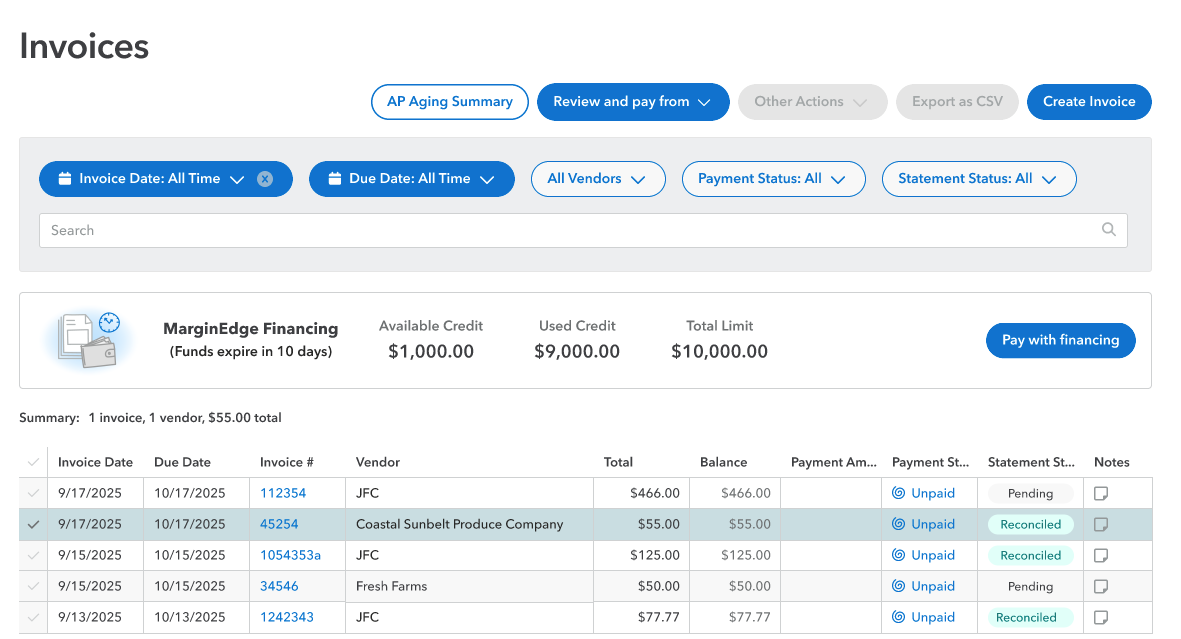 - Integrated experience – manage everything within your existing MarginEdge Bill Pay workflow