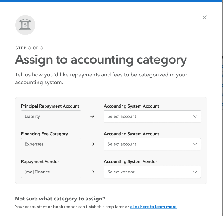 Not sure which accounts to use? Your accountant or bookkeeper can complete this step for you later. You can skip this during initial setup and have them configure it before your first repayment.