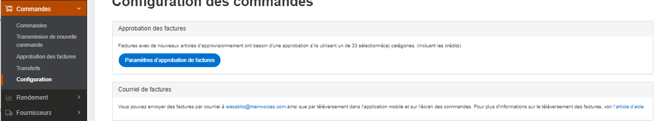 Si vous recevez une facture par courriel et que vous voulez la téléverser dans MarginEdge, il suffit de transférer le courriel ou la facture à la boîte de réception unique de la facture de votre restaurant, que vous pouvez trouver en allant à la page des Commandes > Configuration et en faisant défiler les pages jusqu’à la section Courriel de factures. Vous pouvez également utiliser cette adresse de courriel si vous voulez qu’un fournisseur nous envoie automatiquement vos factures par courriel.