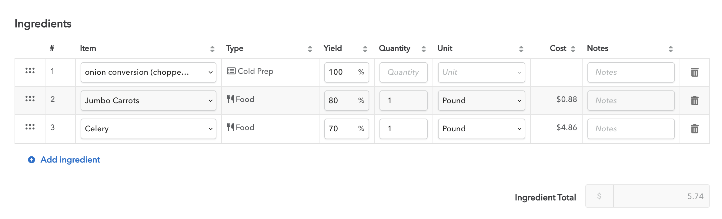 Lorsque le rendement est abaissé, le coût de l’ingrédient dans la recette augmente. Plus vous pouvez comptabiliser précisément le rétrécissement ou le gaspillage, plus le coût de votre recette sera exact !