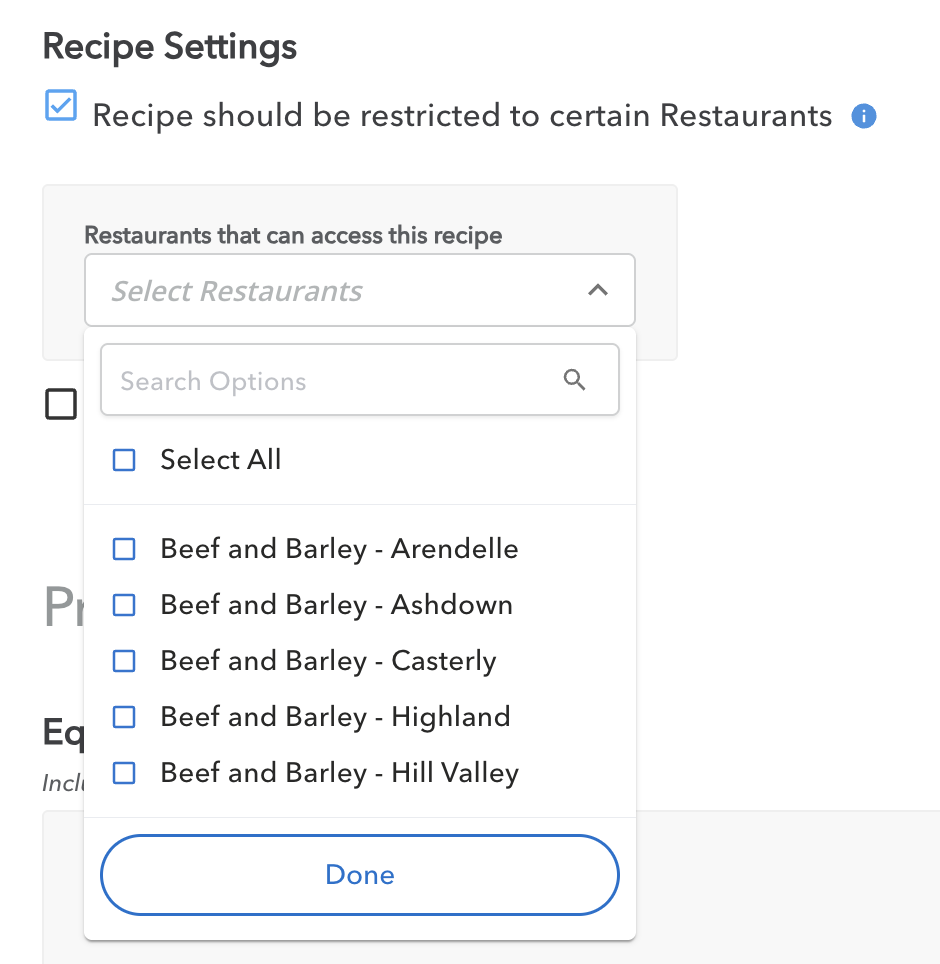 Lorsqu’elle est cochée, vous pouvez choisir les restaurants ayant accès à la recette via une liste consultable.
